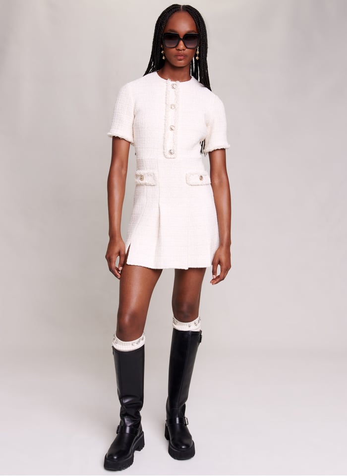 Short Round Neck Tweed Dress Ecru Maje Women Place Des Tendances